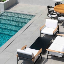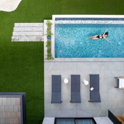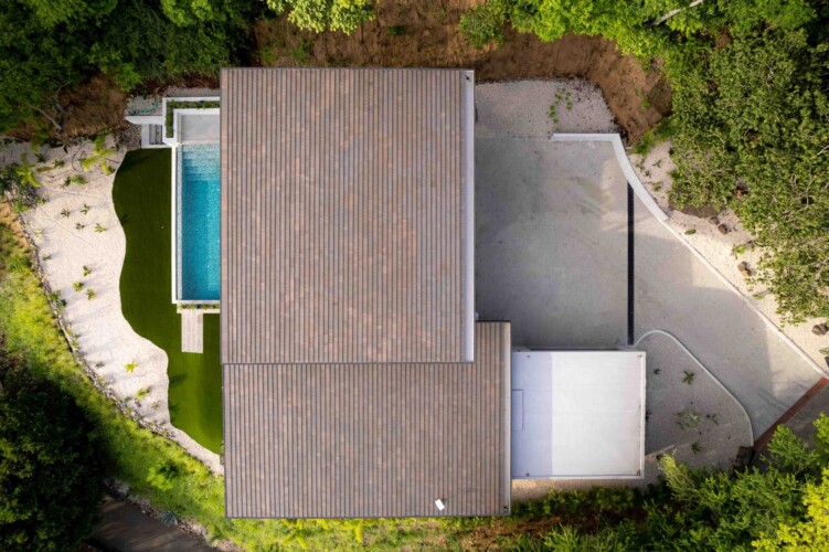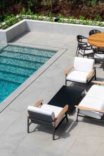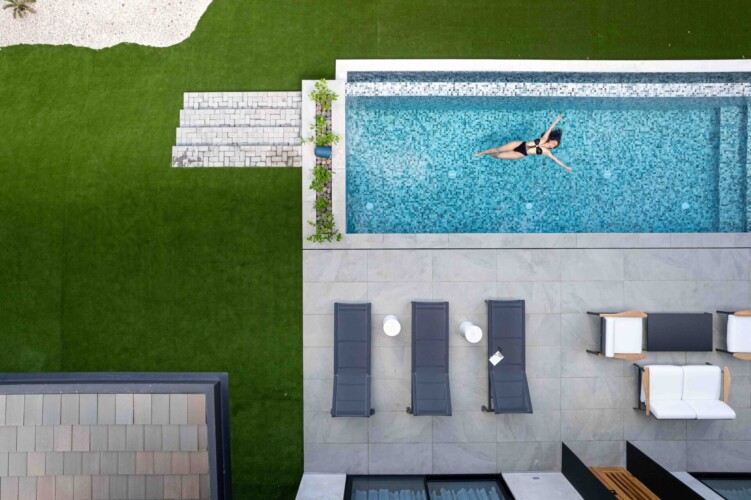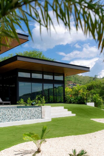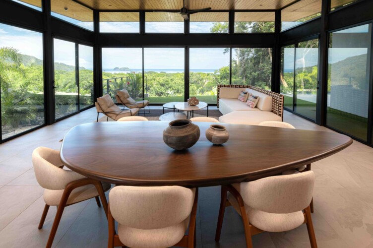 Designed for those who love to flow between indoor and outdoor spaces, Casa Armonía opens fully to its expansive terrace and pool area through floor-to-ceiling glass doors. A green turf lawn surrounds the infinity-edge pool, creating a natural extension of the living and dining spaces. This thoughtful design allows guests to gather in one harmonious setting—whether lounging poolside, entertaining friends, or simply savoring golden sunsets.